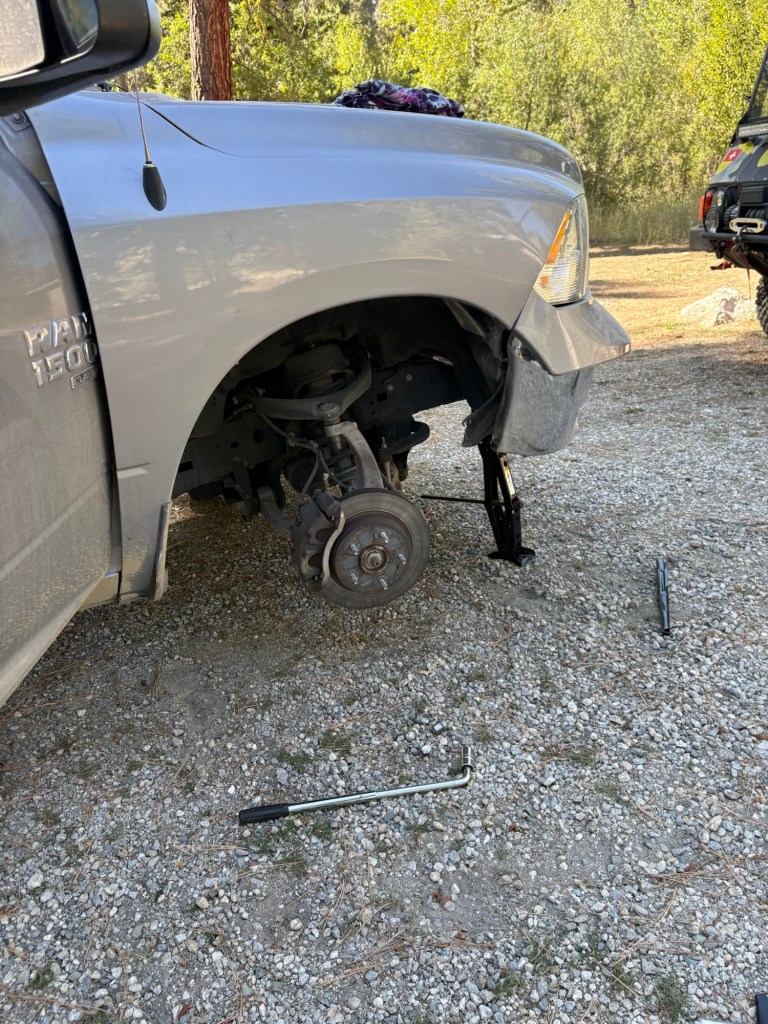 Of course, the Baumgartner Campground for the Idaho Tenkara Camp Out was only a few miles away. I drove and heard a noise when I was turning the wheel, but didn’t think too much of it. Little did I know that my tire light was about to come on as I pulled in campground. I was driving on the rim! The truck had a full spare so Tom then changed my tired with me…For the first time. More on that later.