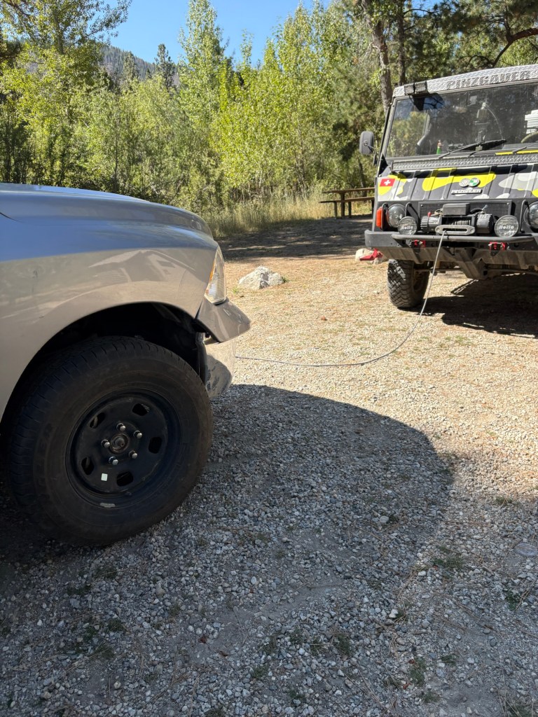 As I came up and over a little hill, I was creeping down this turning hill and took the corner too loose. The shoulder had about 5’ of unpacked and soft dirt that took the truck right into a ditch. Tom wasn’t far behind me and had a winch on his 1973 Pinzgauer. Lucky me! It was the first time he used it, but it was what did the trick to get my truck pulled over a huge rock that was behind my driver side tire. It didnt take long and I was back on the road with fender damage.