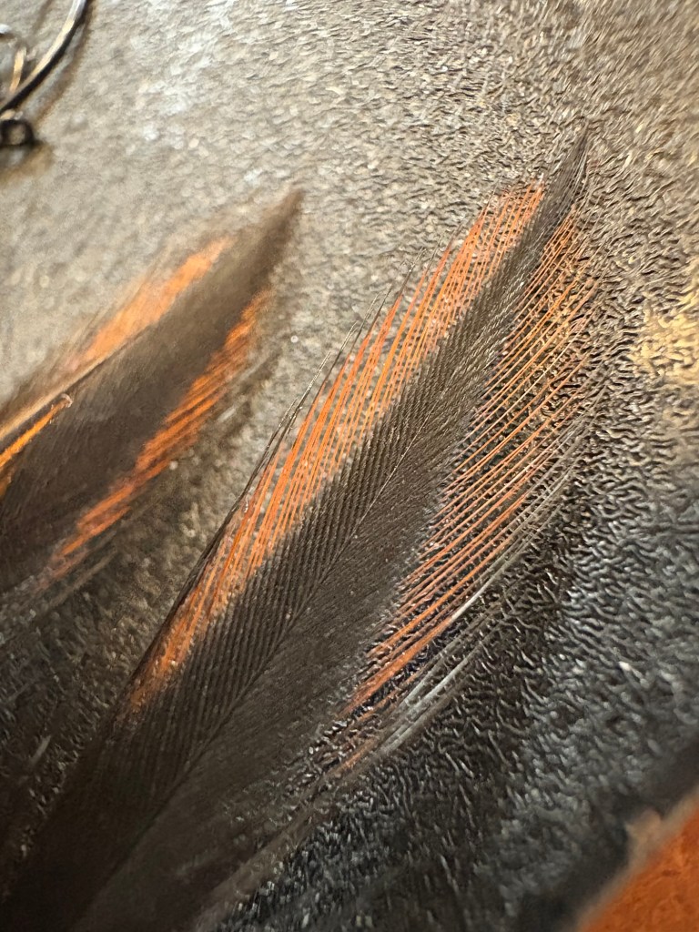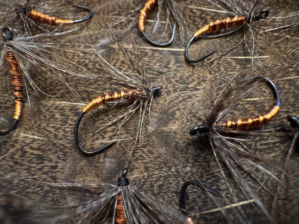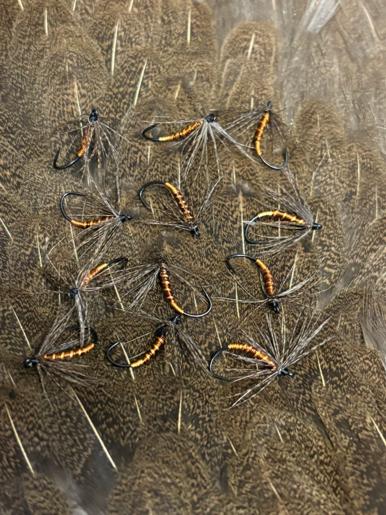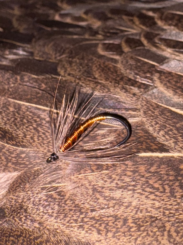 Next up, a soft hackle jun kebari on a size 12 Daiichi 1251 hook. The body is made up of thin copper wire wrapped from bend to eye and rubbing it with the same thing copper wire used on the previous fly. The hackle really sets this fly apart from anything other fly. It is from my best friend’s American Gamefowl, this one being specifically a hen, he raises in Maine. I enjoy tying most with hen as I enjoy soft hackle and this specific speckled pattern is unlike any other I have seen in person or on the internet.