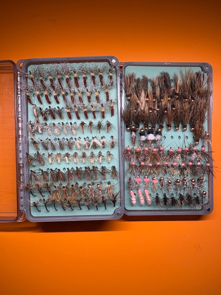 From fishing the blue lines up and down the East coast for brook trout and other wild fish, I became accustom to tying up and using my own flies for the fish I would target. The brookies which I mainly targeted in these remote areas are not picky. They are opportunistic and hungry. For the most part, as long as the fish are active and you have not scared them, then the fish are willing to take a fly. Regardless of the size of the fly or the fish. I usually only fish one or two patterns on each outing. One being a weight less fly and one being a weighted bead head.