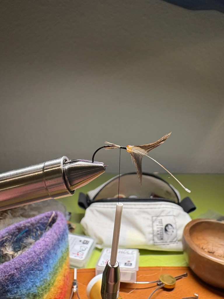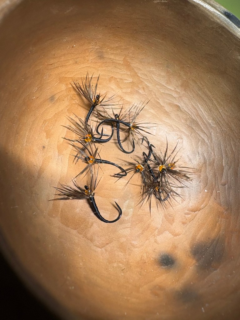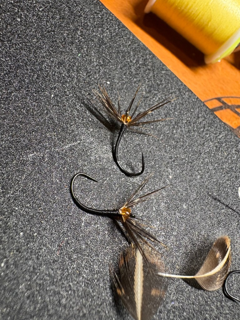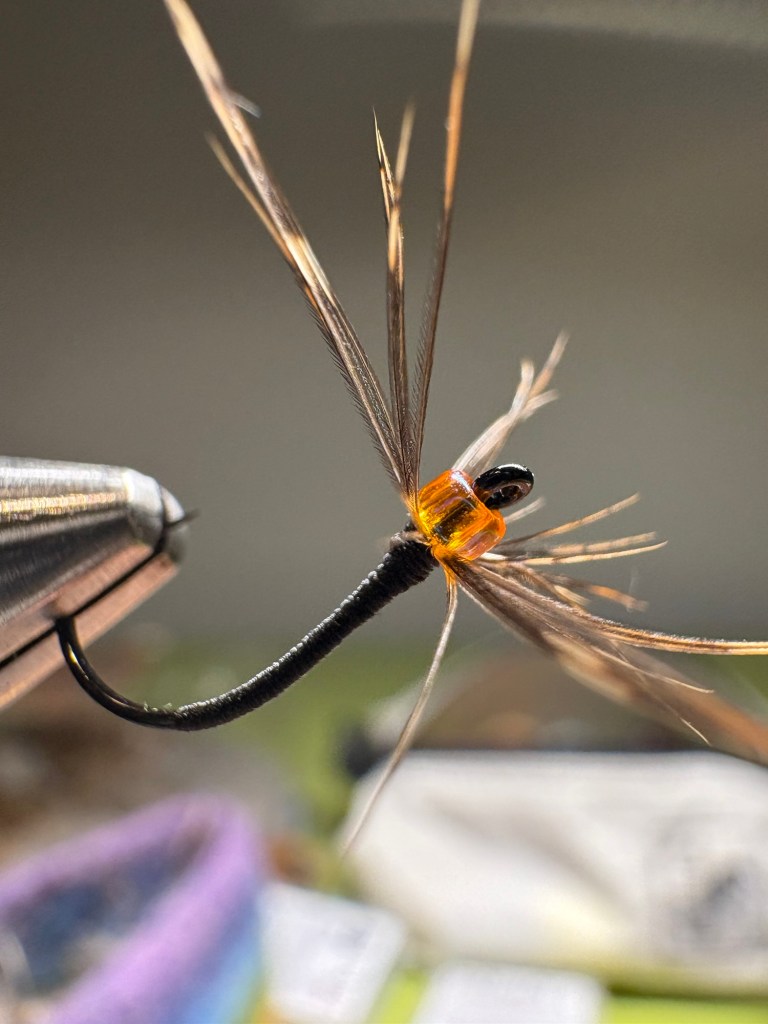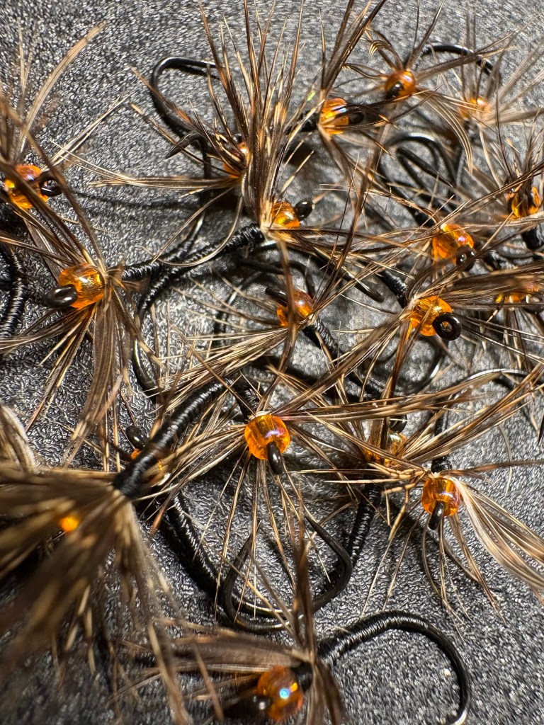 I tied up these soft hackle sakasa kebari on a size 12 Daiichi style 1251 hook and I added a see-through orange bead near the eye. There is my flash! The orange bead. These I will add to my fly box as they are extremely close to the usuals I have used on the East coast, they are quick to tie, and they add just enough flare to not be annoying to my eye.
